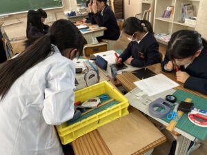 1月22日(木)、6年生はSTEAM教育推進事業で、龍野高等学校から2名の先生と8名の高校生に来てもらって授業を受けました。STEAM教育とは理数教育に創造性教育を加えた教育理念です。(詳しくはインターネット等でお調べください)