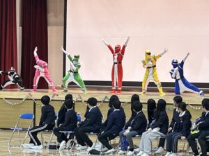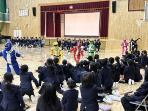 5年生代表の開会の言葉の後、登場したのは神レンジャー。全校児童憧れのヒーローです。神レンジャーがステージに勢ぞろいすると、6年生の活躍や思い出を振り返り、「これからは自分たちが神岡小をリードします」とバトンを受け継ぎました。続いて、各学年からの出し物です。どの学年も、6年生に贈る言葉やゲームなどで楽しい時間をつくり、6年生にプレゼントを贈ったり、感謝の言葉を伝えたりしました。