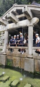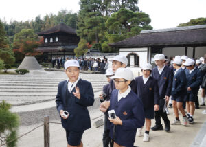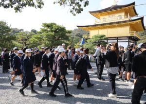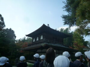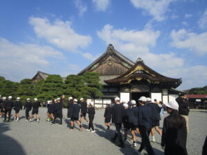 2日目は室町文化を今に伝える慈照寺銀閣からスタート。趣ある庭園に心癒されました。次は二条城。廊下のうぐいす張りの音を楽しんだり、人形で再現された将軍と諸大名との謁見の様子を見たりして、江戸時代に思いを馳せました。そして鹿苑寺金閣。晴れ渡る空のもと、想像以上にまばゆく光り輝く金閣。湖面に映る姿の鮮やかさに見とれました。修学旅行の最後はお待ちかねの東映太秦映画村。時代劇のセットやアトラクションを楽しみ、お土産もしっかり買いました。